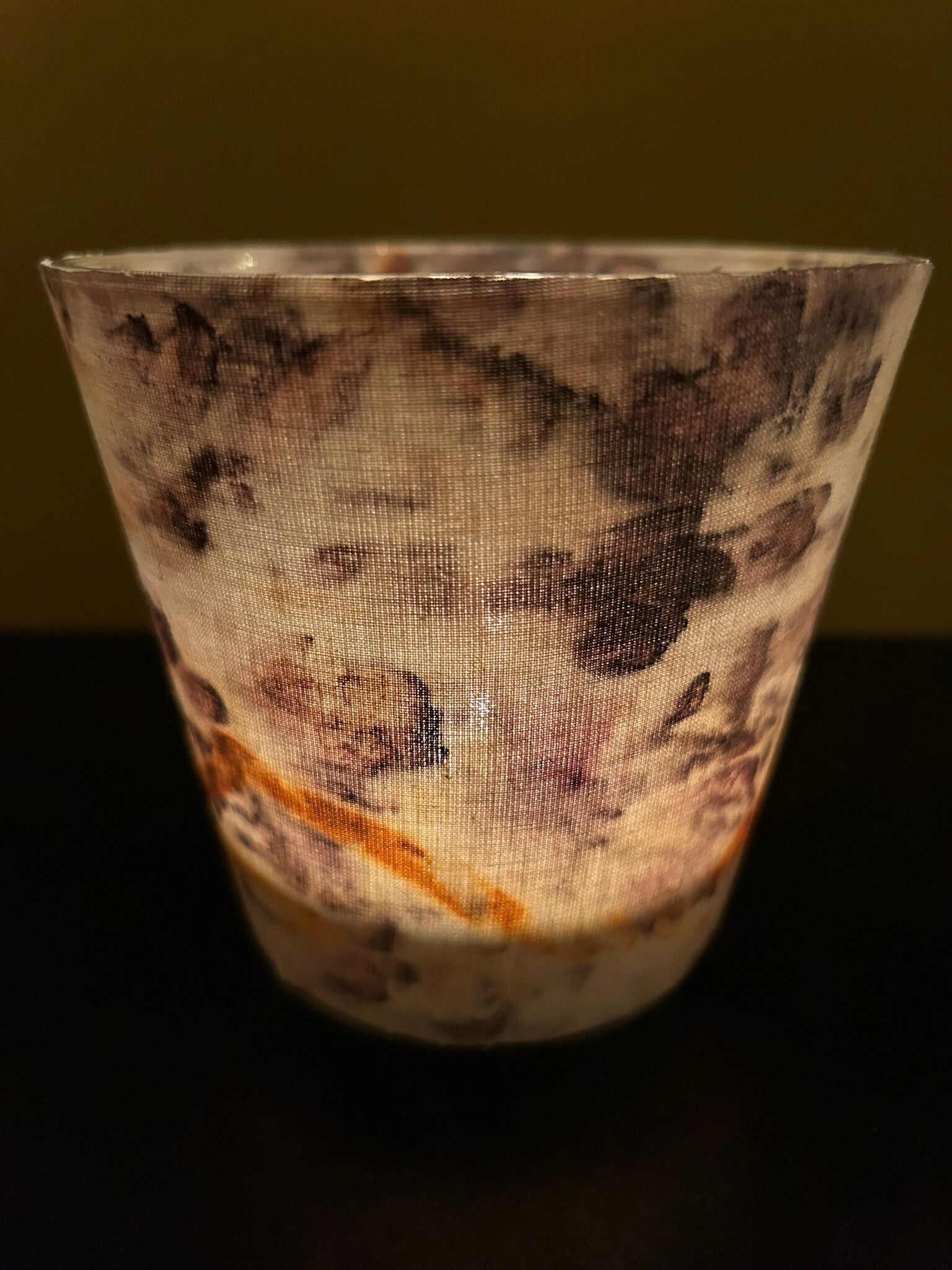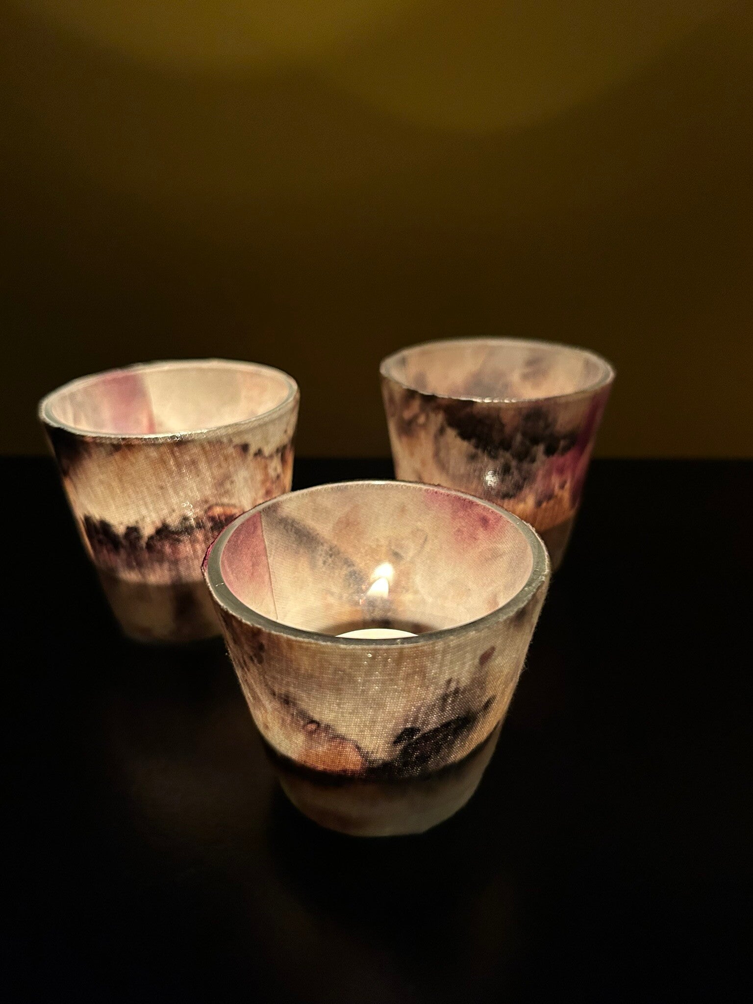 Oud glas van de kringloop wordt bewerkt met restjes van de geprinte stoffen en dat leidt met een waxinelichtje tot zeer sfeervolle verlichting. Zolang de voorraad strekt kan je kiezen uit verschillende kleurtonen zoals blauw, geel, grijs, groen, oranje, rood/aubergine en combi's ervan. Per stuk 20 euro; twee stuks 37,50 euro; drie stuks 55 euro. Natuurlijk erg leuk als duurzaam cadeau voor een verjaardag of met de feestdagen. Ben je geïnteresseerd neem dan contact op want ze worden vervaardigd per bestelling om onnodige voorraad te voorkomen. Let op: zorg dat je op tijd bent voor een bestelling voor de feestdagen!